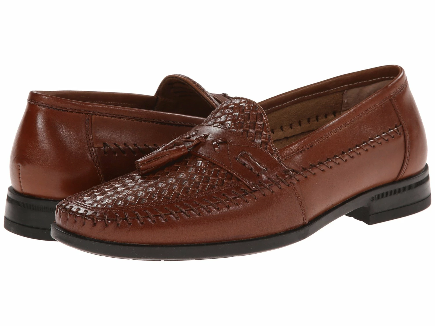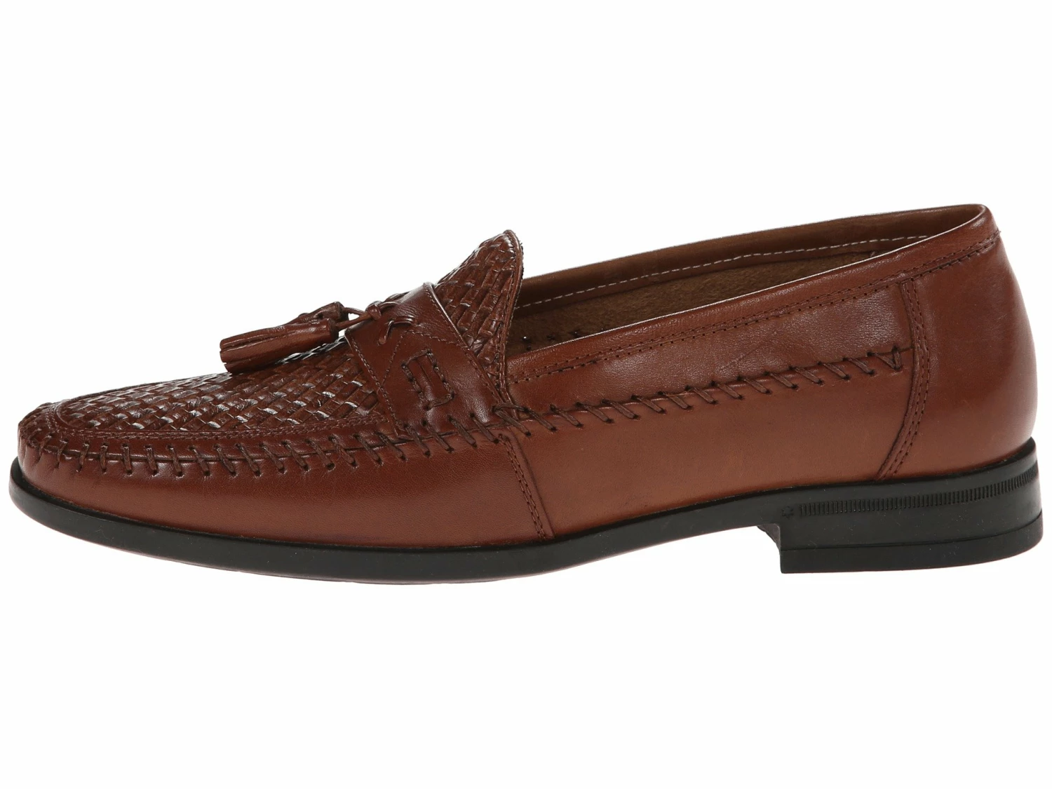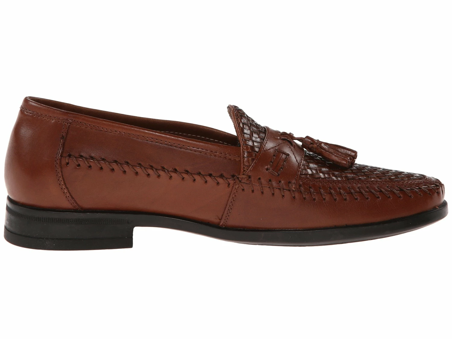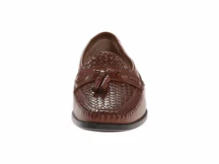 - This slip-on features premium woven leather upper with detailed stitching and tassels at vamp.