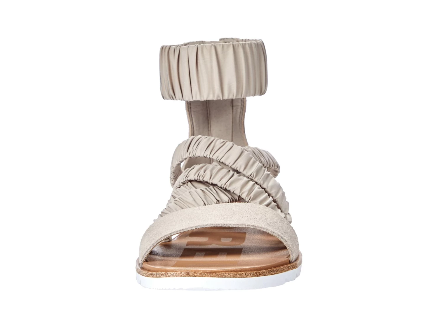 - Full grain leather upper with a crisscross textile strap design at the instep.