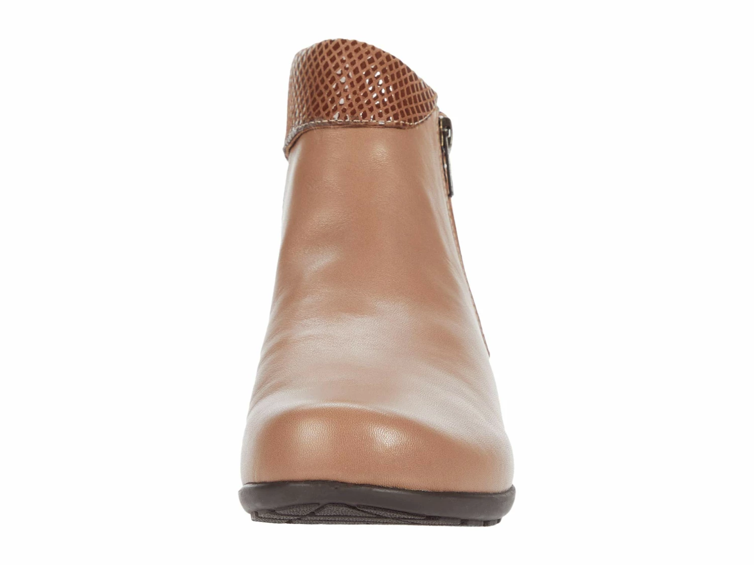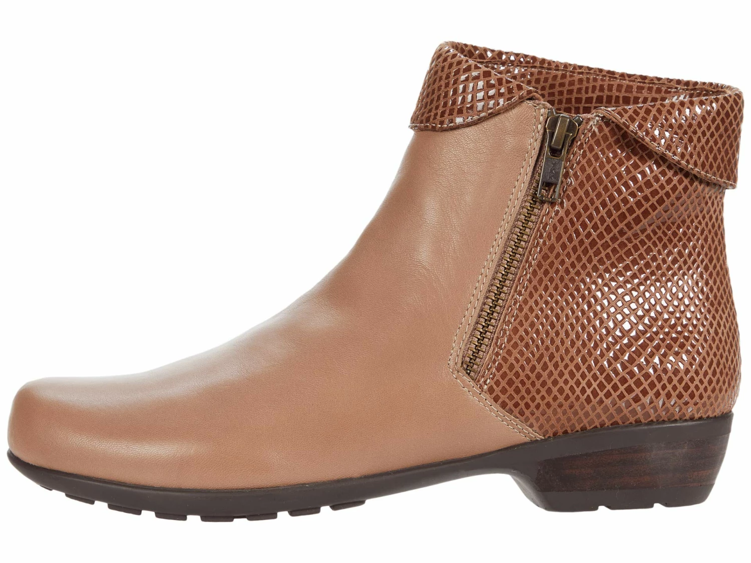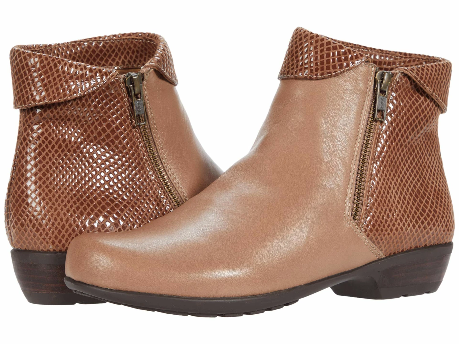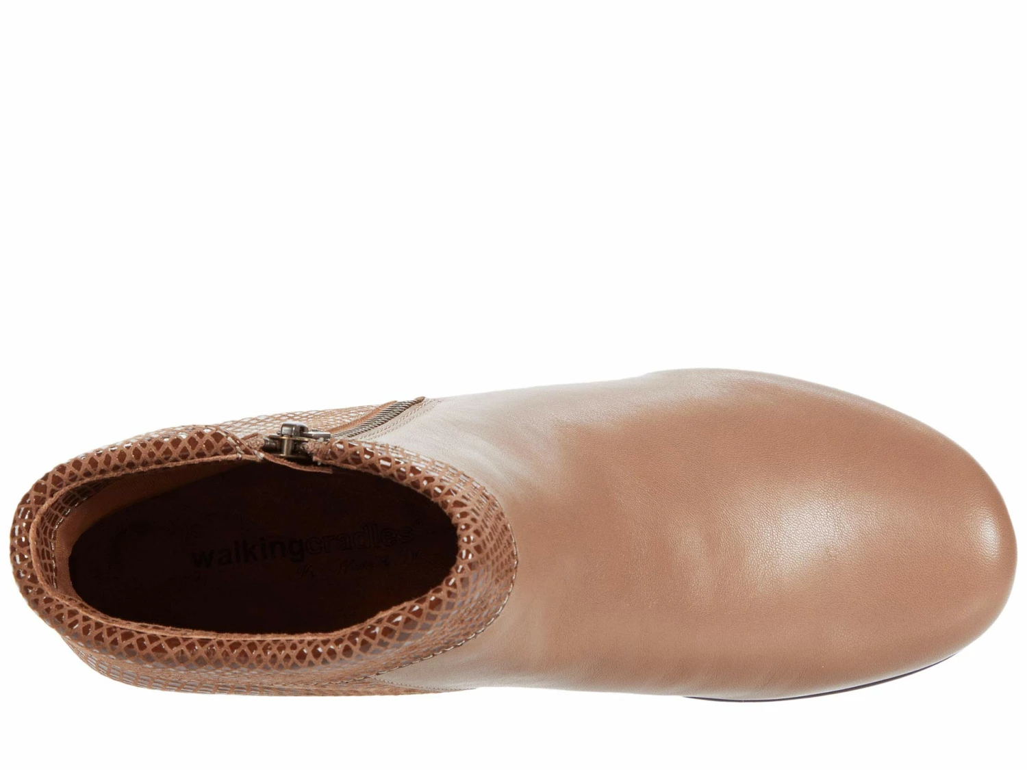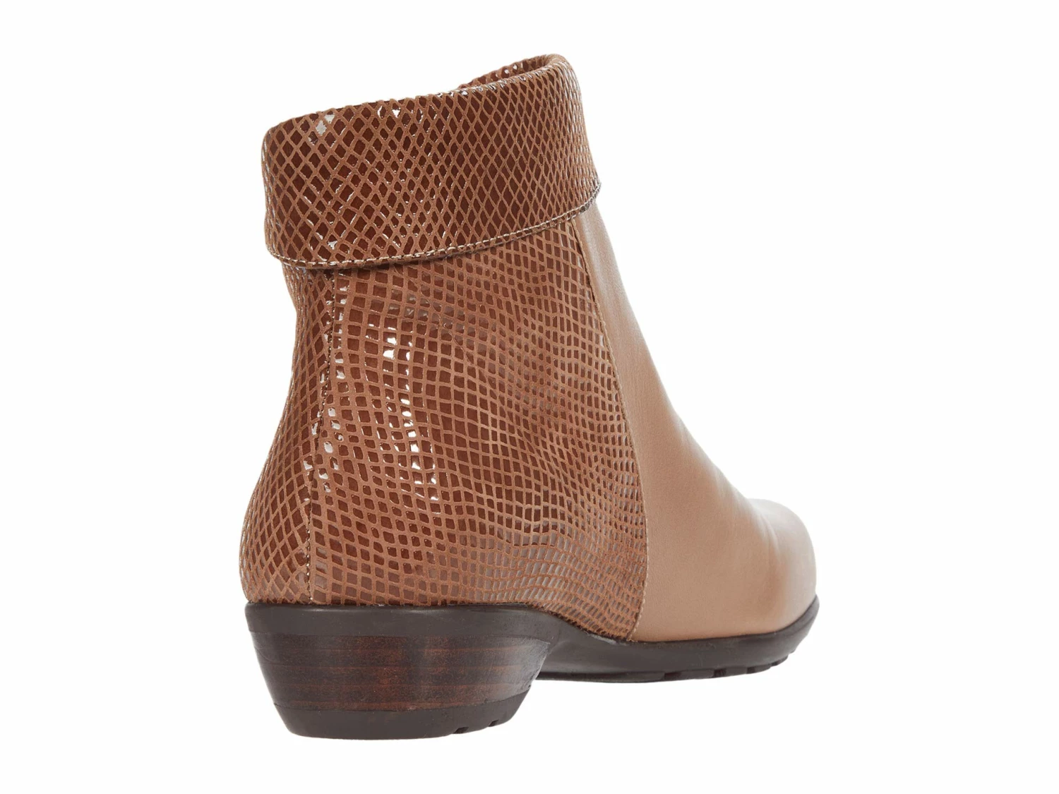 - The Walking Cradles® Emmy ankle bootie comes in a smooth and supple leather upper with a chic snake-printed folded collar and quarter.